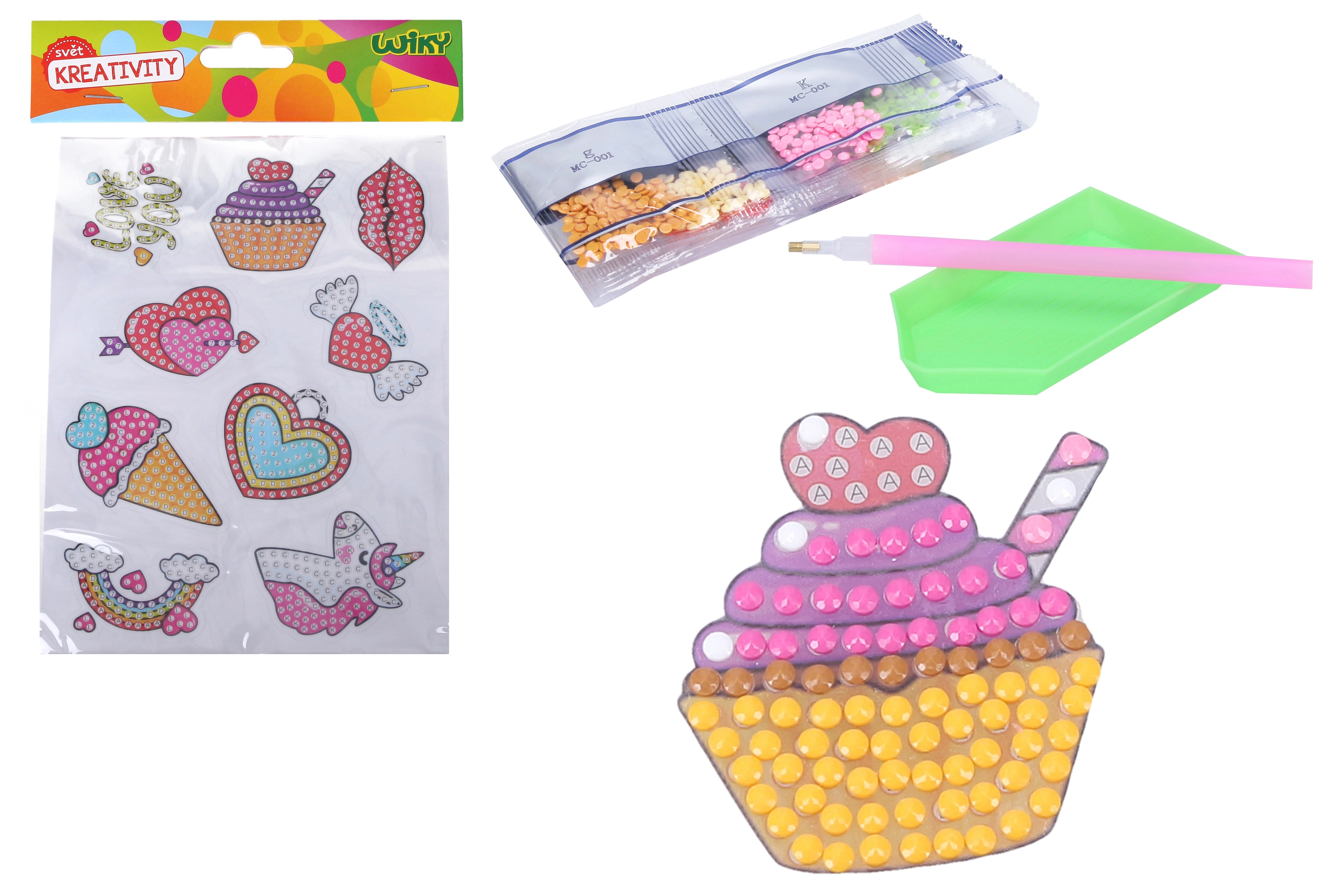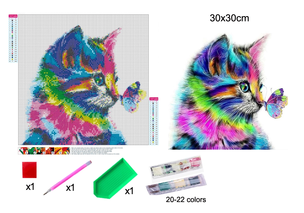 Každá sada diamantového malování obsahuje předtištěné plátno s lepicí vrstvou a legendou DMC, akrylátové kamínky (kulaté/hranaté), aplikátor/pero s voskem, tácek a sáčky na třídění; často také pinzetu. Díky kvalitnímu tisku, silné přilnavosti a přesnému potisku se kamínky snadno usazují a výsledná diamantová mozaika září jako 5D křišťál. Tvoření je snadné na začátek, ale vede k detailnímu obrazu a rozvíjí soustředění i jemnou motoriku.