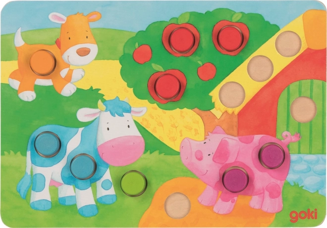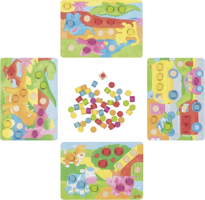 Tato vkládací hra GOKI přináší dětem zábavu a zároveň edukaci. Děti se naučí rozpoznávat a vkládat barevné kameny do obrázků. Hra zahrnuje: