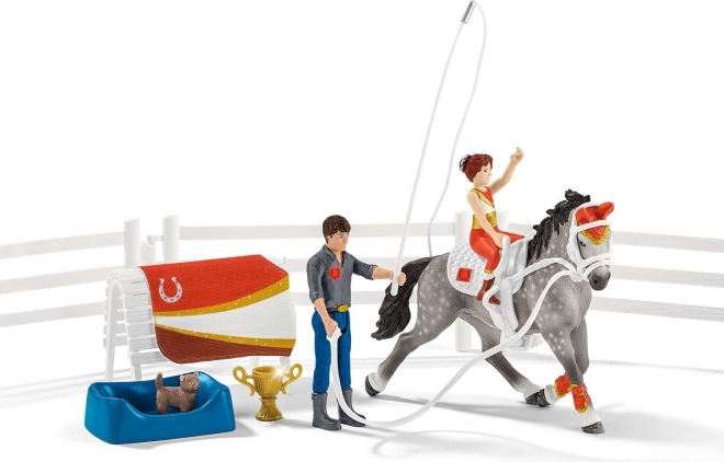 - Kompletní výbava pro voltíž: kůň, jezdkyně Mia, trenér Tom, ohrada, sedlo, uzdečka, martingaly, lano a bič.