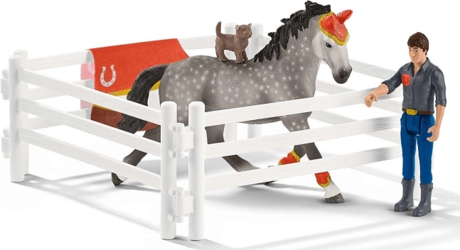 Součástí je tréninkový kruh z ohradníků, trenér s vodítkem a bičem pro klidné vedení koně, odkládací lavice na výstroj a velká zlatá trofej pro šampiony. Hra rozvíjí jemnou motoriku, představivost a vztah ke zvířatům.