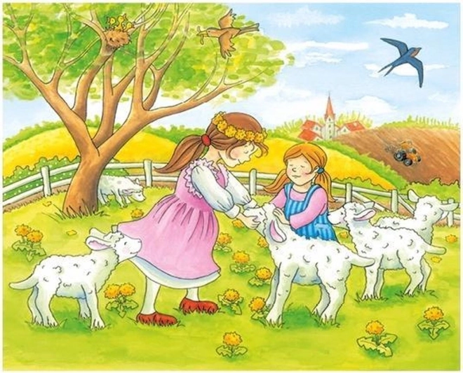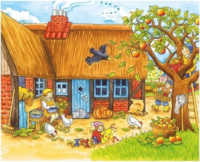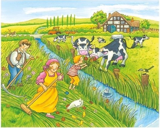 Objevujte venkovský svět se zvířátky a lidmi během celého roku. Z 12 pevných dřevěných kostek sestavíte 6 ilustrovaných scén – od jarního dvora přes letní práce až po zimní radovánky. Kostky jsou ideální pro předškoláky, rozvíjejí koordinaci oko–ruka a učí děti vnímat vztah částí k celku.