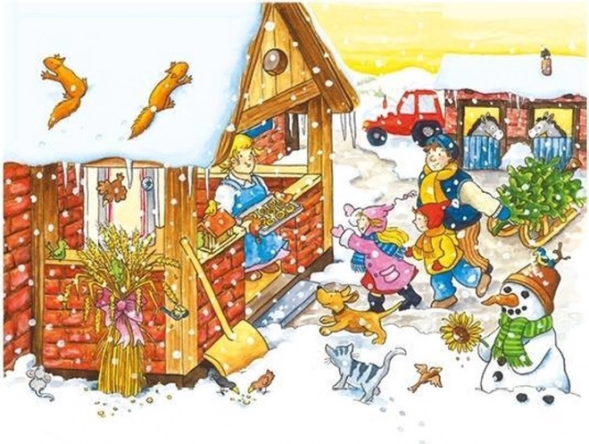 Zimní obrázek se sněhulákem, dětmi a zvířátky podněcuje fantazii a motivuje ke společnému vyprávění příběhů.