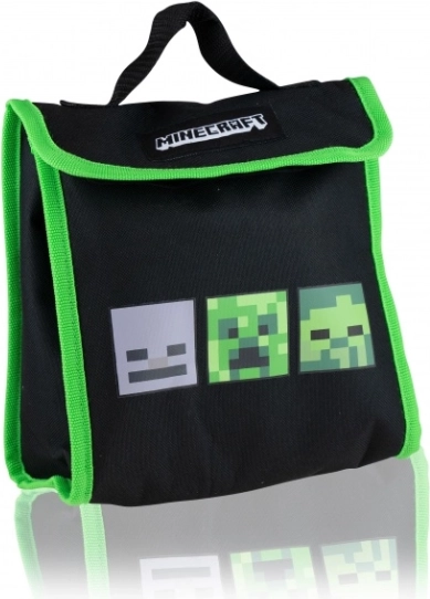 Pytlík na svačinu 18,5 × 11 × 20 cm se zapínáním na suchý zip a plastová láhev o objemu 500 ml (20 × 6,5 cm) – vše v jednotném MINECRAFT stylu.