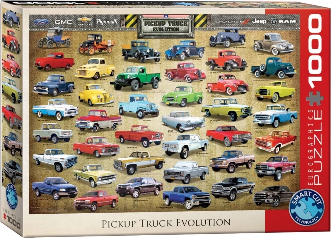 Objevte stylové puzzle s motivem vývoje pick-upů od značky EUROGRAPHICS o 1000 dílcích. Speciální nekonvenční výsek s netradičními tvary dílků zvyšuje obtížnost a přináší delší a zábavnější skládání. Popisky na obrázku jsou v anglickém jazyce. Rozměr po složení cca 67,63 × 48,89 cm.