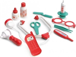 Součástí je 11 kusů doplňků: brýle, stříkačka, teploměr, stetoskop, otoskop, nůžky, 2 nádobky, pinzeta, skalpel a telefon – vše pro malé veterináře.