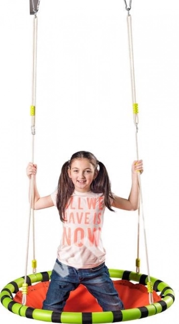Užívejte si relax i zábavu na zahradě s houpacím kruhem WOODY. Velký průměr 103 cm poskytuje dostatek prostoru pro pohodlné sezení na plachtovém sedáku, zatímco pěnový návlek na konstrukci zvyšuje bezpečnost při houpání. Houpačka je určena pro venkovní použití a snadno ji zavěsíte pomocí kovových kroužků na závěsných lanech.