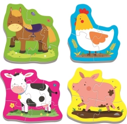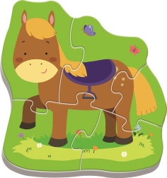 Puzzle s motivem zvířátek ze statku nabízejí zábavnou a vzdělávací činnost pro vaše děti. Tento set obsahuje 18 dílků, ze kterých lze složit 4 různé obrázky zvířat: koníka, kravičky, kuřete a prasátka. S jejich pomocí se děti učí rozpoznávat zvířata a procvičují počítání.