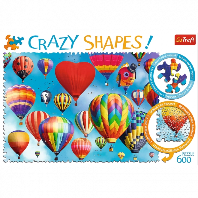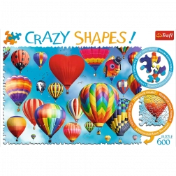 Crazy Shapes! Tato série představuje nejbláznivější puzzle na světě, kde kostky mají neobvyklý, šílený tvar a nenajdete žádné přímé linie. Tento produkt obsahuje 600 dílků a obrázek ukazuje létající barevné balóny.