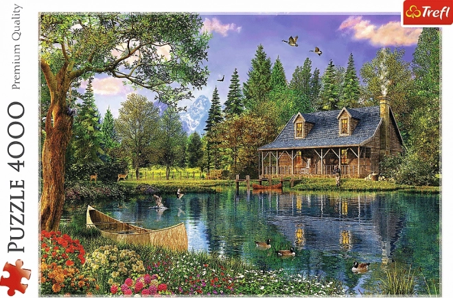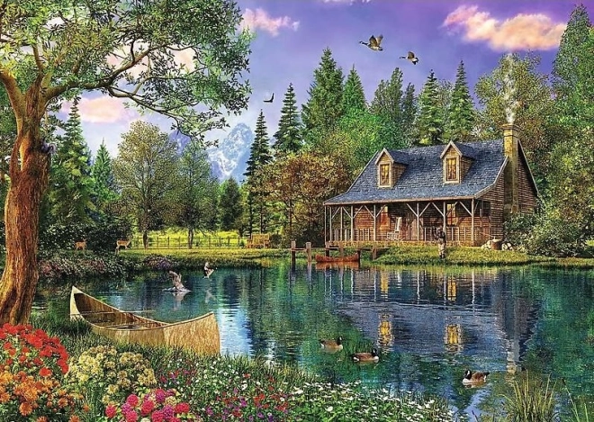 Vychutnejte si klidnou atmosféru přírody s velkoformátovými puzzle, které zobrazují dřevěnou chatu u klidného jezera obklopenou stromy a divokou přírodou. Po složení vznikne detailní obraz o rozměrech 136 × 96 cm – ideální k zarámování a ozdobení interiéru.