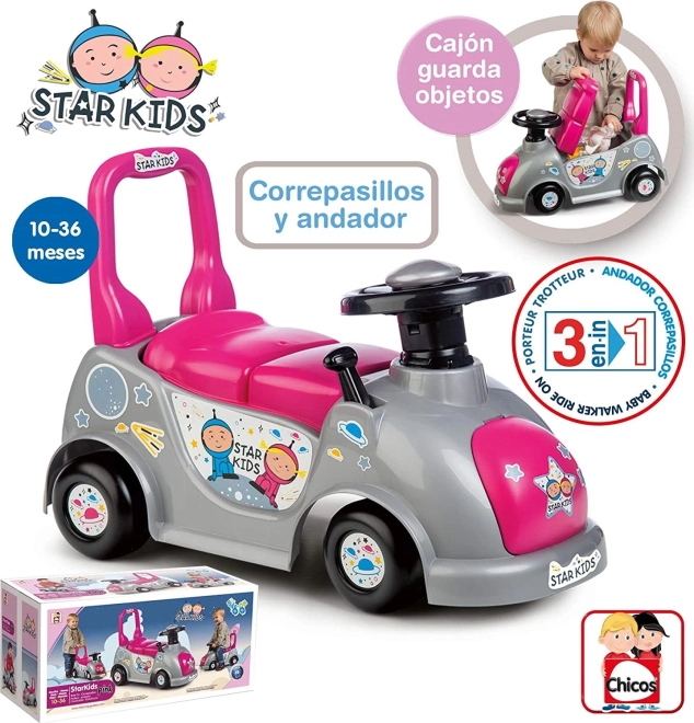 Hledáte první vozítko pro své děťátko? Odrážedlo 3v1 Star Kids růžové roste s dítětem – nejprve pomůže jako chodítko při prvních krůčcích a následně jako stabilní odrážedlo pro rozvoj rovnováhy a jistoty pohybu. Díky kompaktním rozměrům se skvěle hodí do bytu i na procházky.