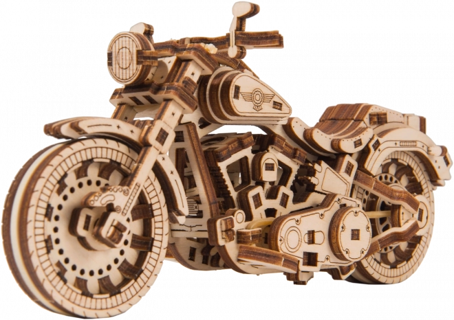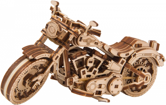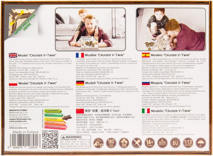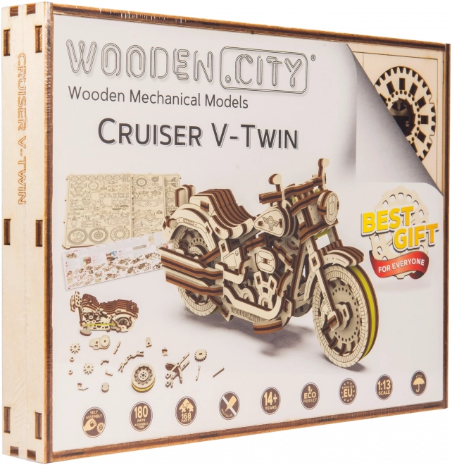 WOODEN CITY Cruiser V‑Twin je detailně zpracovaný dřevěný model v měřítku 1:13, který spojuje zábavu ze stavění s autentickým mechanickým zážitkem. Díky setrvačnému pohonu ujede motorka po natažení až 1 metr, má funkční řízení předním kolem, pohyblivé válce při otáčení zadního kola a pružící přední vidlici.