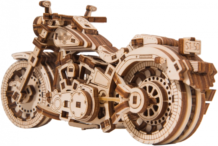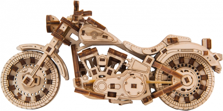 Model se skládá z kvalitní březové překližky, jednotlivé části do sebe přesně zapadají a k montáži není potřeba lepidlo. Užijete si pohled na ozubená kola, převody i brzdové kotouče a pogumovaná kola. Nechybí designové prvky jako stojan, směrovky, registrační značka, odrazky a zrcátka – ideální dárek pro fanoušky motocyklů a technických skládaček.