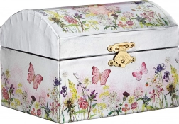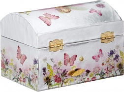 Tato šperkovnice ve stylu hrací skříňky spojuje půvabný vzhled a funkčnost. Stříbrné provedení s leskem doplňují jemné květinové a motýlí motivy, uvnitř nechybí oválné zrcátko a otočná baletka. Po otevření víka zazní slavná melodie Labutího jezera, která provází každé uložení prstýnku či náušnic do bezpečí.