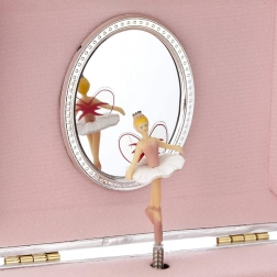 Po otevření víka se před oválným zrcátkem roztočí baletka a zazní jemná melodie labutí jezero – kouzelný rituál při každém uložení šperků.