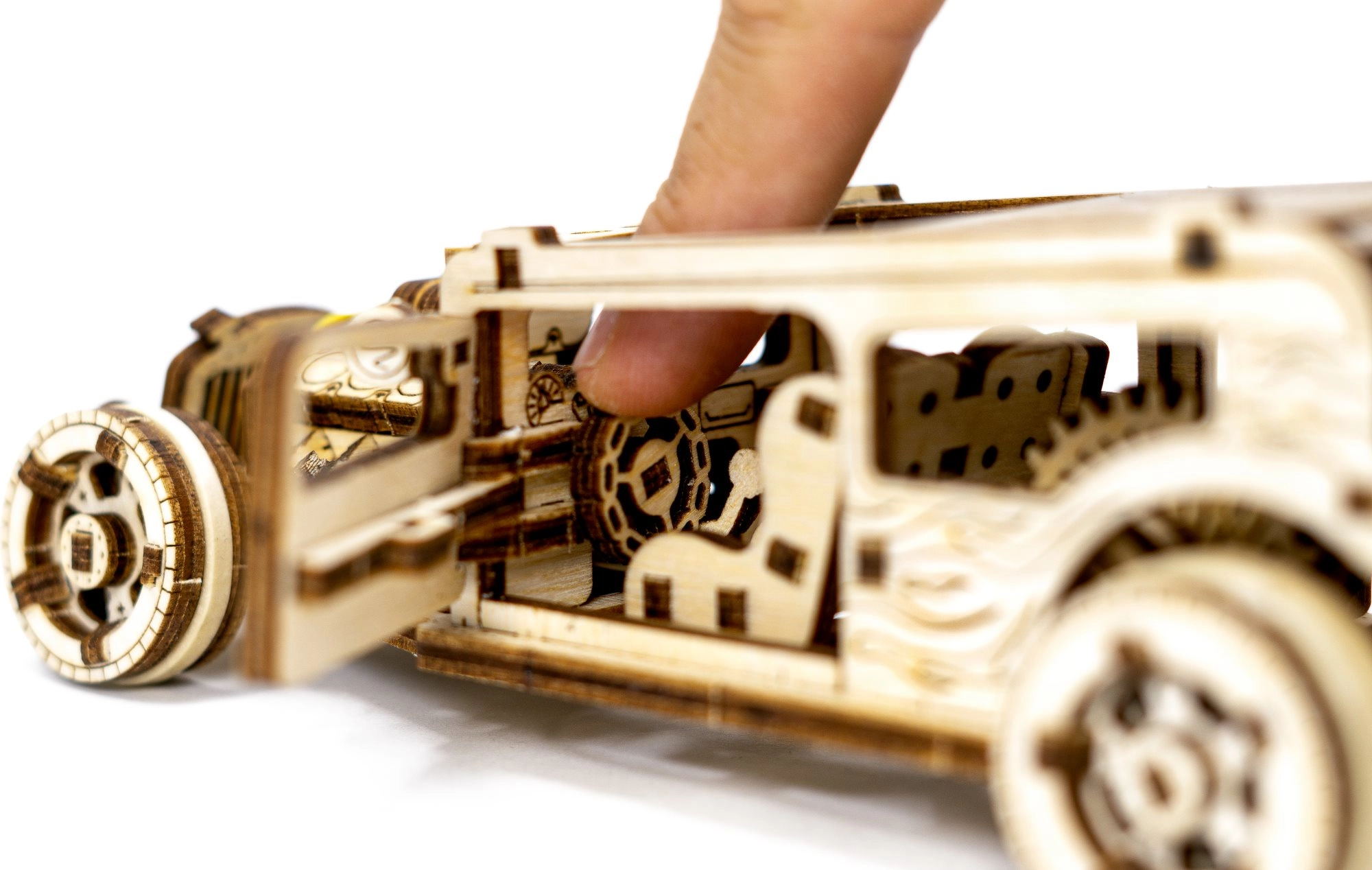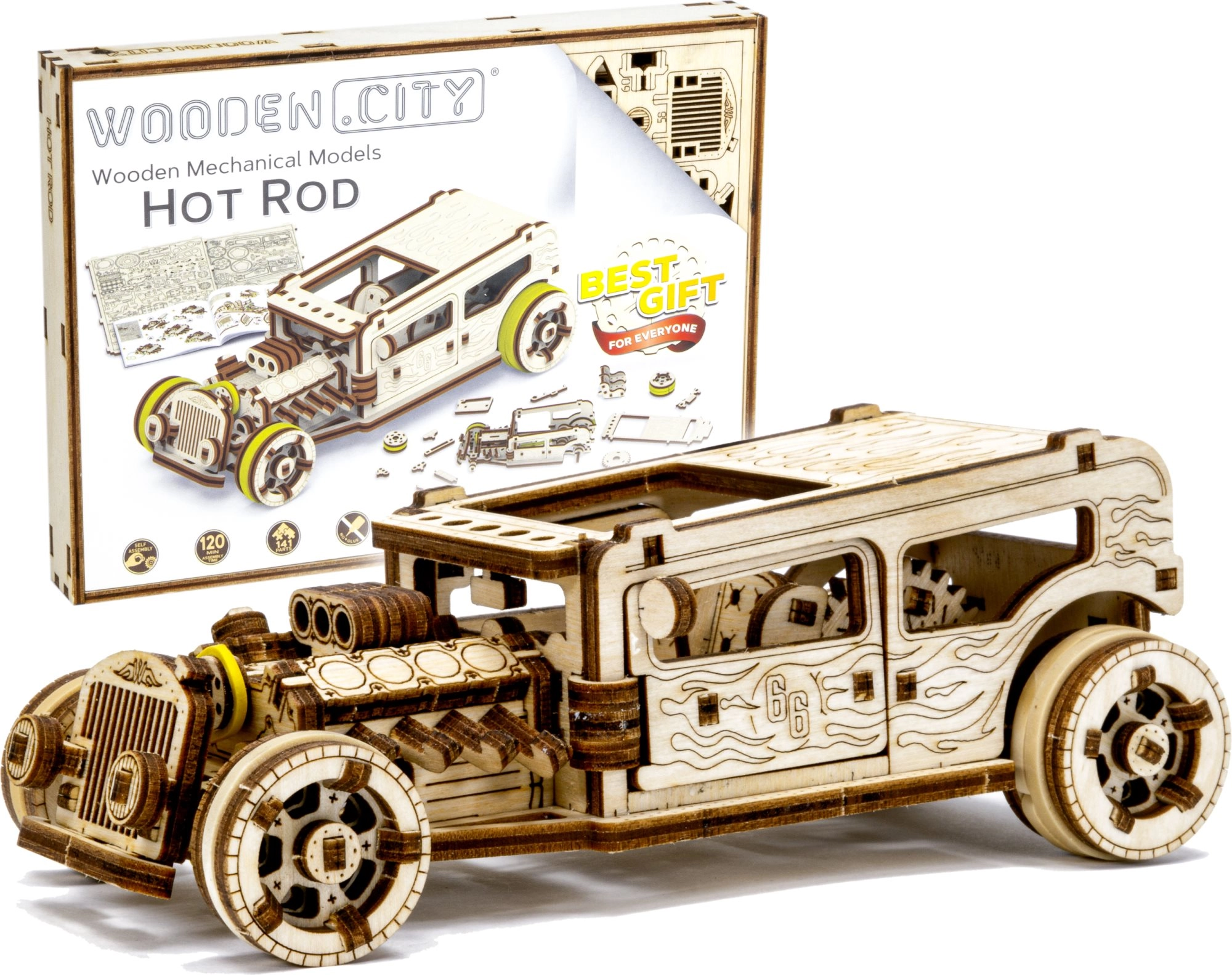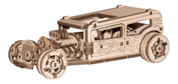 Vychutnejte si stavbu realistického modelu Hot Rodu z přírodního dřeva. Díky přesnému laserovému výřezu a chytrým zámkům dílů se model skládá bez lepidla a nářadí. Hot Rod má přední otočná kola, setrvačníkový mechanismus, otevírací dveře se zarážkou a „poznávací značku“ jako skutečné auto.