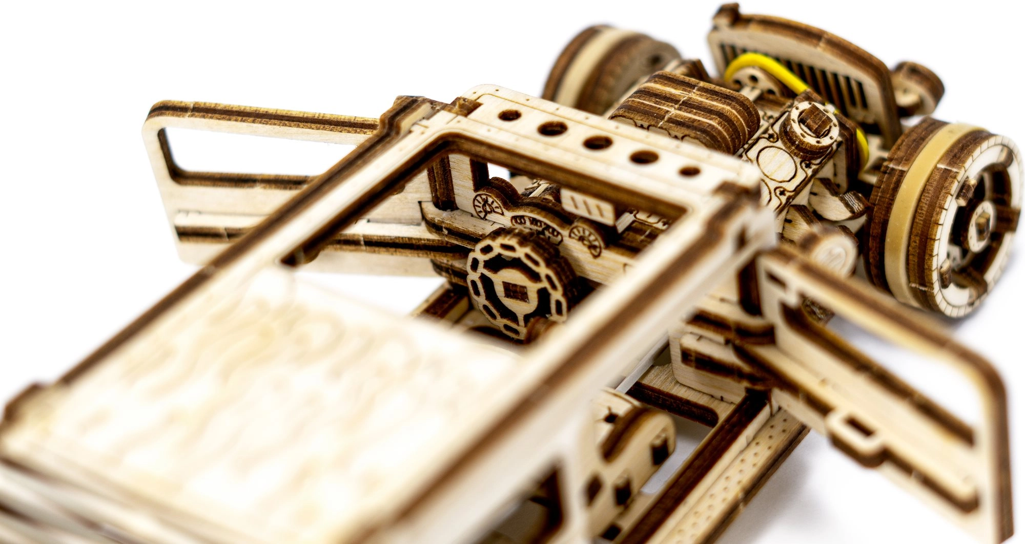 Laserem vyřezaná březová překližka, čisté spoje a skládání bez lepidla. Stačí základní pomůcky a navoskovat převody pro hladký chod.