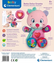 Medvědice Bára od BABY CLEMENTONI je hebká výuková plyšová hračka, která motivuje nejmenší k objevování světa pomocí světla, mluveného slova a písniček. Děti se naučí rozpoznávat písmena, čísla, barvy a tvary pouhým dotykem tlačítek, zatímco svítící srdíčko dodává hře kouzelnou atmosféru.
