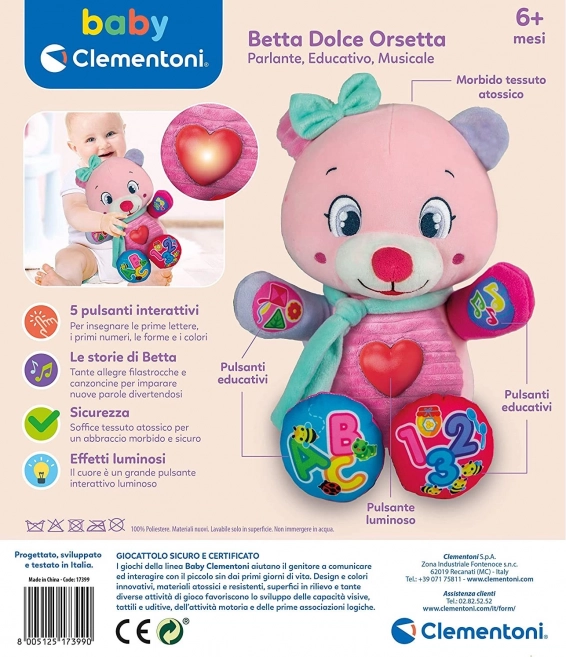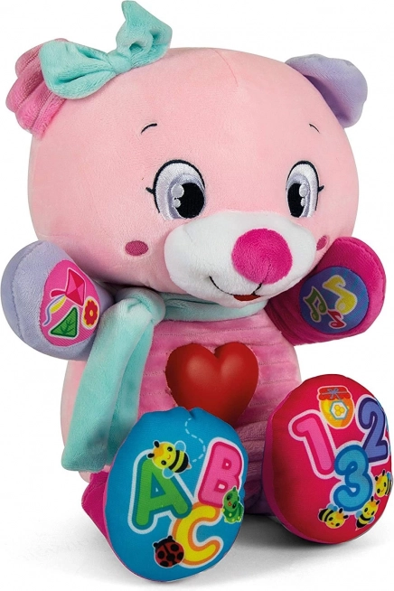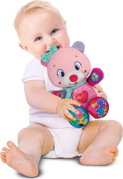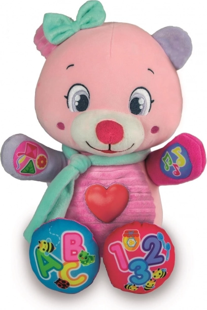 Superměkká mluvící medvědice, která spojuje učení a zábavu. Dotykem 5 interaktivních tlačítek učí písmena, čísla, tvary a barvy. Svítící srdíčko reaguje při mluvení a zpěvu. Hra ve 4 jazycích (CZ, SK, PL, HU). Napájení 2× AAA.