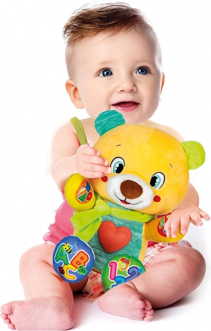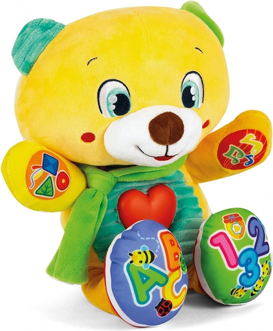 Superměkký mluvící medvídek, který spojuje učení a zábavu. Dotykem 5 interaktivních tlačítek učí první písmena, čísla, tvary a barvy. Svítící srdíčko reaguje při mluvení, písničkách a říkankách. Hračka mluví česky, slovensky a maďarsky (jazyk se nastavuje u baterií).