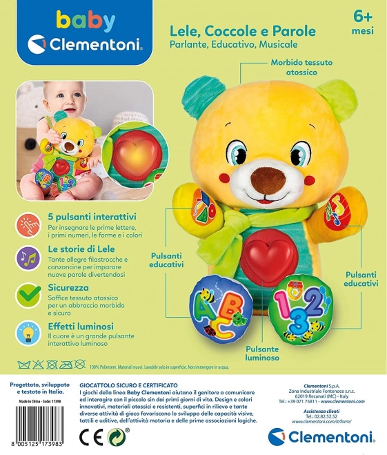 Interaktivní plyšový medvídek Knoflík od BABY CLEMENTONI je ideální společník pro nejmenší. Díky měkkému hebkému provedení a pestrým barvám podporuje smyslový rozvoj, zatímco chytré funkce děti hravou formou seznamují s abecedou, čísly, tvary a barvami. Svítící srdce na bříšku doprovází mluvené fráze, písničky a říkanky.