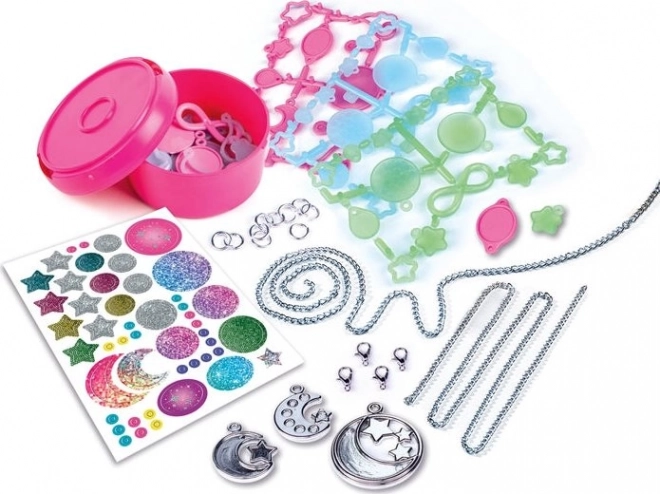 Objevte svět fantazie s kreativní sadou pro výrobu šperků Crazy Chic. Díky kombinaci svítících přívěsků, stříbrných efektů a třpytivých nálepek vytvoříte náramky a náhrdelníky, které vyniknou ve dne i v noci. Ideální pro děti, které milují tvoření a chtějí vyjádřit svůj styl.