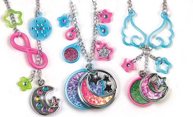Sada je připravena k okamžitému použití – stačí vzít přívěsky ve tvaru měsíce a hvězd, připojit je pomocí kovových kroužků a háčků na dodané řetízky a dotvořit vzhled třpytivými nálepkami. V balení najdete i přehledný obrázkový návod v češtině, takže výroba je jednoduchá a zábavná.