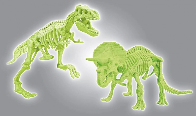 Fluorescenční díly kostry absorbují denní světlo a ve tmě září. Hotové modely T‑Rexe a Triceratopse jsou efektní dekorací i vzdělávací pomůckou.