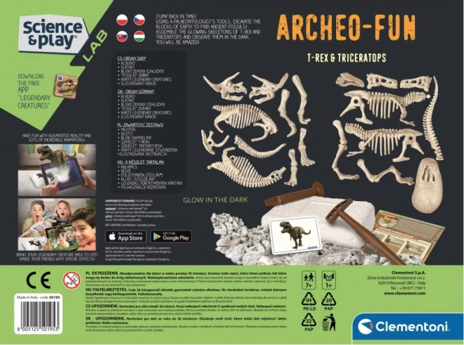 Součástí je ilustrovaný návod a vzdělávací karty s fakty o dinosaurech a fosiliích. A díky bezplatné aplikaci Legendary Creatures s rozšířenou realitou se kostry promění v interaktivní 3D modely – ideální kombinace učení a hry. Skvělé pro děti od 7 let, které milují dinosaury, experimenty a objevování.