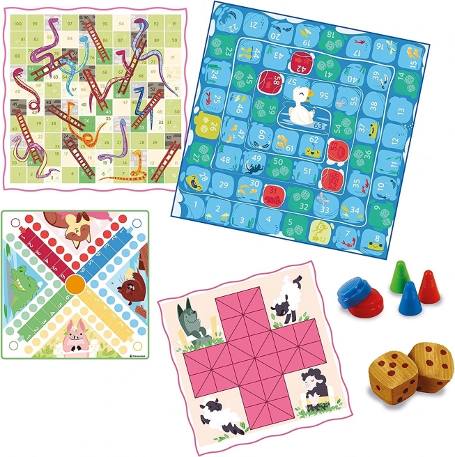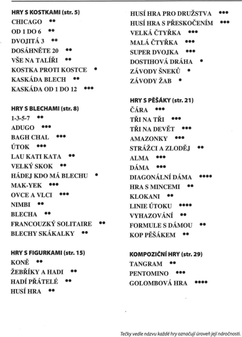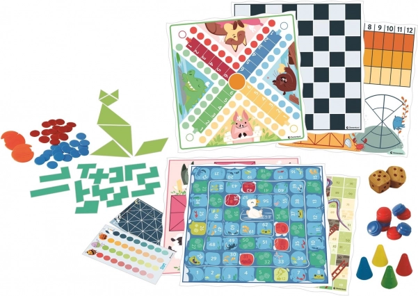 Na pěti oboustranných deskách najdete mimo jiné Koně, Dámu, Husí hru, Žebříky a hady, Bleší dostihovou dráhu, Ovce a vlci, Čáru, Adugo, Dostihovou dráhu, Kaskádu blech, Bagh Chal, Lau Kati Kata, a logické skládačky Pentamimo a Tangram. Díky různým obtížnostem se skvěle hodí pro děti i dospělé.