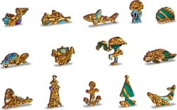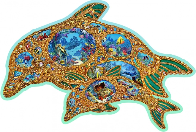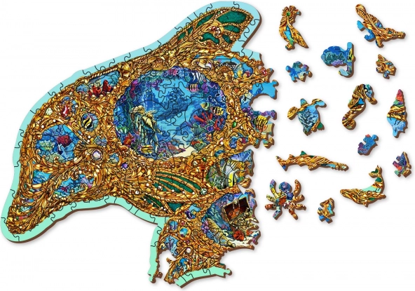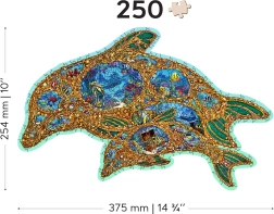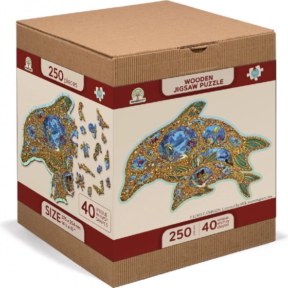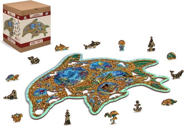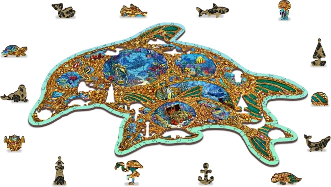 Dopřejte si originální zábavu s dřevěným puzzlem ve tvaru delfína inspirovaným podmořským světem. Díky speciálně tvarovaným dílkům – z nichž část má podobu mořských živočichů – je skládání vizuálně atraktivní a zároveň náročnější než u klasických puzzlí. Laserem zvýrazněné detaily dodávají motivu hloubku a některé dílky lze postavit jako drobné figurky.