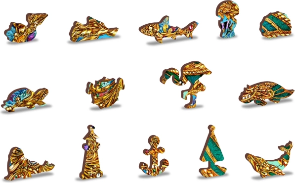 Barevný podmořský design se speciálními dílky ve tvaru mořských živočichů a rostlin dodává skládání originalitu i radost z objevování.