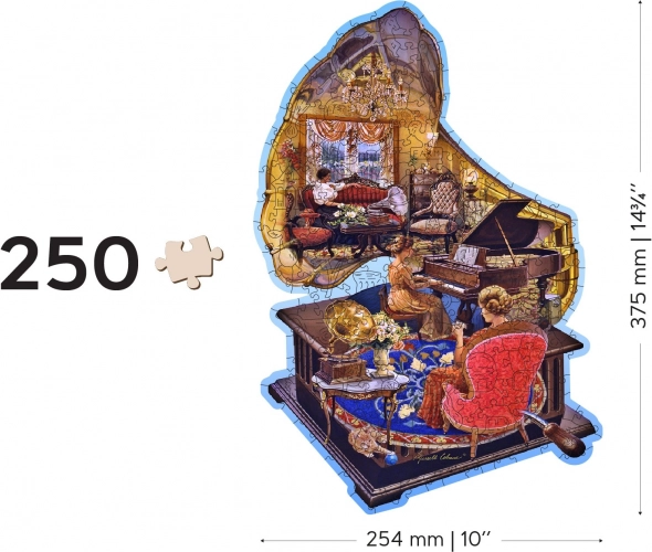 Toto designové dřevěné puzzle ve tvaru klavíru a s vintage motivem útulného salonku s gramofonem nadchne každého, kdo miluje elegantní umění a chytré skládání. Díky laserem řezaným, hladkým hranám a pevné HDF desce se dílky dokonale propojují a zůstávají odolné i při častém skládání.