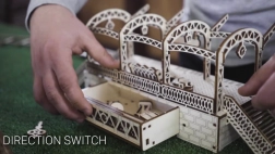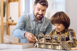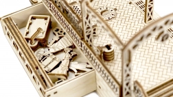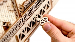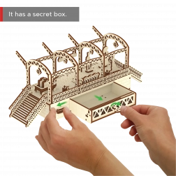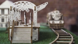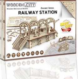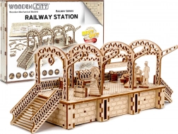 Dřevěné 3D puzzle WOODEN CITY Železniční stanice přináší autentickou atmosféru nádraží s dekorativními oblouky, lavičkami a postavičkami cestujících. Sestavení probíhá bez lepidla či nářadí, jednotlivé díly přesně zapadají a výsledný model je nejen dekorativní, ale i funkční – drobnosti snadno schováte do tajné přihrádky.