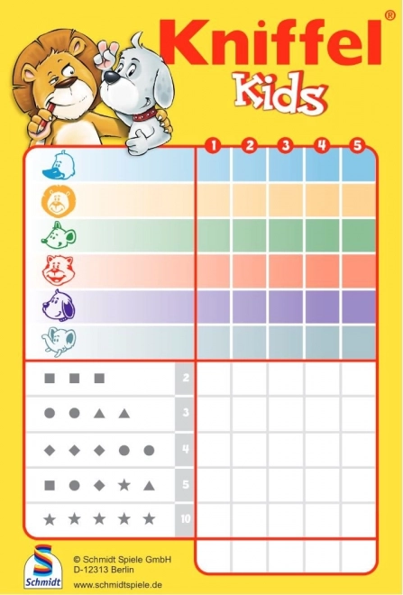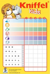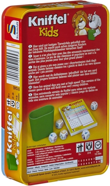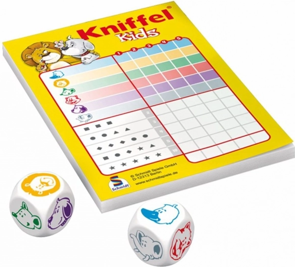 Kniffel Kids je oblíbená rodinná hra v dětské verzi, která rozvíjí postřeh, logiku a jednoduché počítání. Hráči hází kostkami se zvířátky, snaží se poskládat co nejvýhodnější kombinace a zapisují výsledky do přiloženého bloku. Díky pevné plechové krabičce je hra skvělá na výlety, dovolené i do restaurace.