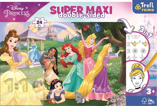 Oboustranné puzzle Super Maxi přináší dětem dvojnásobnou porci zábavy. Jedna strana nabídne barevný motiv s princeznami DISNEY PRINCESS a 24 velkých dílků, které se malým ručkám snadno skládají. Druhá strana slouží jako omalovánka a jednoduchá aktivita s počítáním, která podporuje logické myšlení a koordinaci oko–ruka.