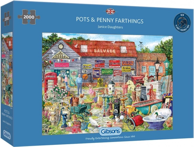 Objevte kouzlo nostalgie s velkým puzzle od Gibsons – Hrnce a veteš za pár drobných o 2000 dílcích. Čeká vás detailně ilustrovaná scéna z dvora plného pokladů, která nadchne milovníky starožitností i náročné skládače. Součástí je předloha motivu a po složení vznikne kvalitní, velkoformátový obraz o rozměru 98 × 68 cm.