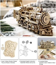 Zažijte vzrušení z montáže s tímto jedinečným 3D modelem dřevěné lokomotivy. S pružinovým pohonem se vlak opravdu pohybuje, zatímco parní píšťala dodává autentičnost. Model je navržen pro snadnou montáž bez lepidla, s precizně vyřezanými dílky z překližky.