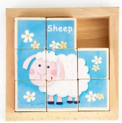 Objevte zábavné dřevěné kostky pro nejmenší s motivy ovečky, krávy a kočky a trojí podobou číslic – klasické, římské a puntíky. Kostky rozvíjejí motoriku, koordinaci, logické myšlení i fantazii a zároveň učí anglické názvy zvířat. Ideální volba pro děti od 3 let.