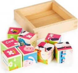 Tato sada 8 pevných dřevěných kostek ECOTOYS přináší hodiny smysluplné zábavy. Děti si z nich mohou poskládat 3 roztomilé obrázky – ovečku, krávu a kočku – a zároveň se učit jejich anglické názvy. Strany s čísly představují číslice hned ve třech formách: arabské číslice, římské číslice a puntíky jako na hrací kostce.