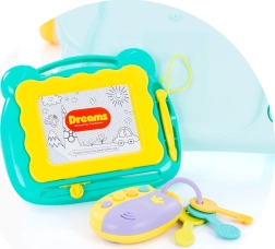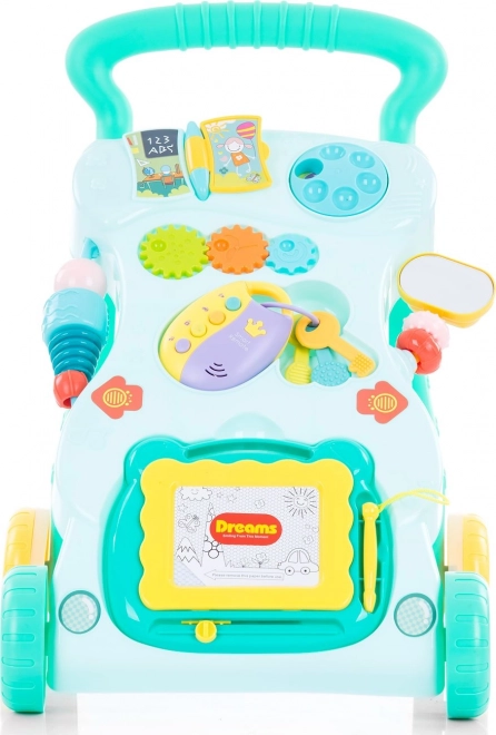 Odnímatelné doplňky, jako jsou klíče s ovladačem a kreslicí tabulka, lze používat i samostatně. Chodítko je lehké, pohodlné a snadno se ovládá. Zadní kola s protiskluzovou silikonovou podložkou a možnost nastavení rychlosti jízdy pomocí šroubováku zvyšují bezpečí i komfort.