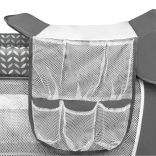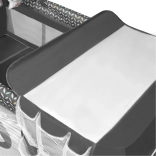 Bezpečí a komfort – LockGuard brání náhodnému složení konstrukce, zaoblené hrany chrání před poraněním a vzdušná síťovina na delších stranách zajišťuje cirkulaci vzduchu i vizuální kontakt. Přebalovací pult s vyvýšenými okraji a dvěma kapsami udrží potřebné pomůcky po ruce. Hrazdička s hračkami rozvíjí motoriku a smysly dítěte.