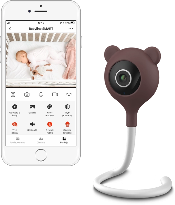Flexibilní stojánek usnadňuje umístění na nábytek či postýlku a stylový design se silikonovým krytem s „medvědími oušky“ zapadne do dětského pokoje. Pro klidné usínání jsou k dispozici ukolébavky a zvuky přírody.