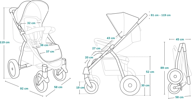 Kočárek jednoduše složíte do kompaktního tvaru pro převoz i skladování. Nastavitelná rukojeť usnadňuje manipulaci různě vysokým osobám.