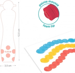 Pěnové barvy DJECO s praktickým houbičkovým aplikátorem jsou ideální volbou pro první tvoření. Děti jednoduše přitlačí a dělají tečky, tahy i vzory – bez štětců a bez nepořádku. Ergonomicky tvarované lahvičky padnou i do drobných dětských ruček a podporují přirozený úchop.