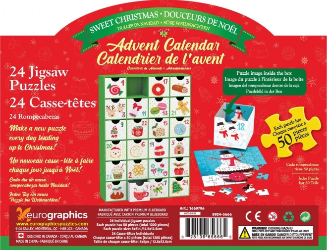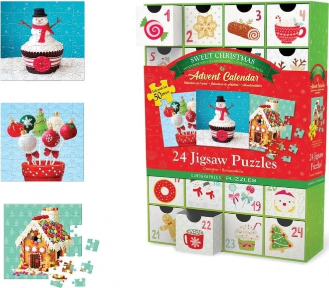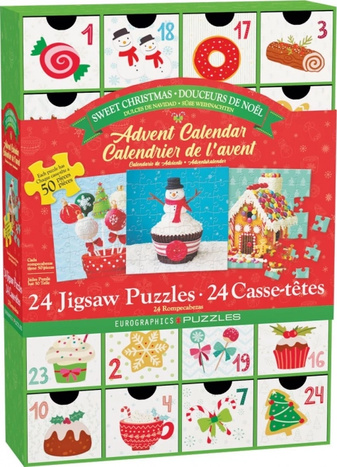 Zkraťte si čekání na Vánoce s originálním adventním kalendářem EUROGRAPHICS. Každý den objevíte nový mini puzzle obrázek s tématem sladkostí. Set nabízí 24 různých motivů, každý o 50 dílcích, v praktickém znovupoužitelném kalendáři se šuplíčky.