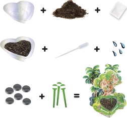 Dílky dekorace, květináč ve tvaru srdce, pipeta, balíček zeminy, obálka se semínky a přehledný návod. Stačí jen sestavit, zasít a pravidelně zalévat.