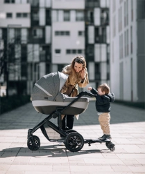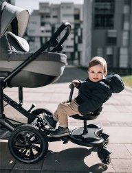 Montáž je otázkou chvilky – systém uchycení je robustní, přitom rychlý a kompatibilní s většinou evropských kočárků. Dvě odolná otočná kolečka o průměru 11,5 cm zajišťují stabilitu a plynulý pohyb ve městě i v parku. Praktická možnost sklopení šetří místo, když stupátko zrovna nepoužíváte.