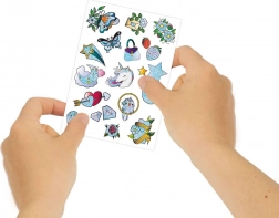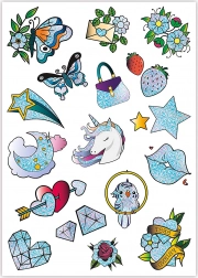 Sada Crazy Chic Třpytivé Tetování obsahuje širokou škálu designů, včetně jednorožců, motýlů a dalších motivů. Tetování se snadno aplikuje a je dermatologicky testované.