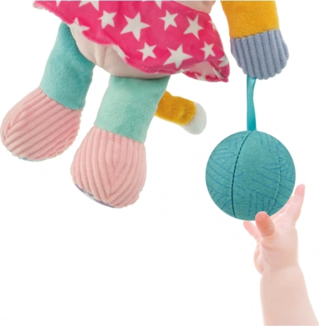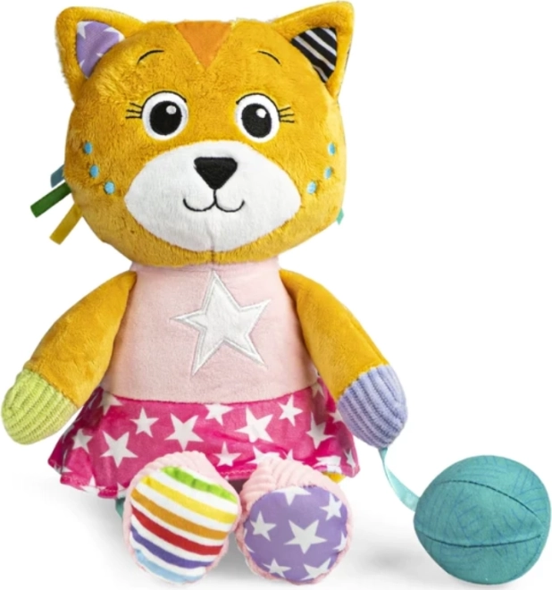 Tato barevná plyšová kočička potěší miminka i batolata svou hebkostí a veselým vzhledem. Různorodé textury a kontrastní barvy podporují rozvoj smyslového vnímání, zatímco integrované chrastítko ve tvaru míčku láká ke zkoumání a uchopování.