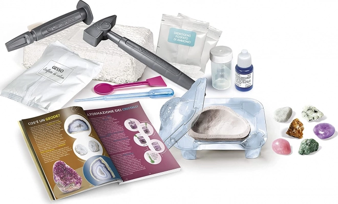 S touto sadou se děti stanou malými geology: pomocí kladívka a dlátka vytěží z připravené cihly ukryté drahokamy a nerosty, které mohou zařadit do své sbírky. Součástí je také forma na výrobu vlastní geody, kterou lze ozdobit barevnými a třpytivými krystaly.
